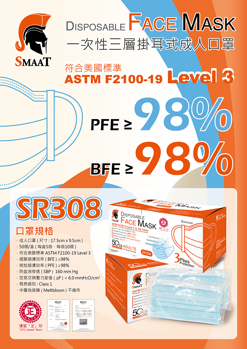 SMAAT SR308 一次性三層掛耳式成人口罩(50個裝)